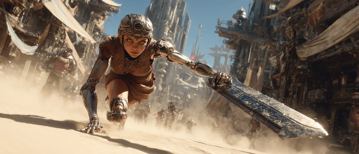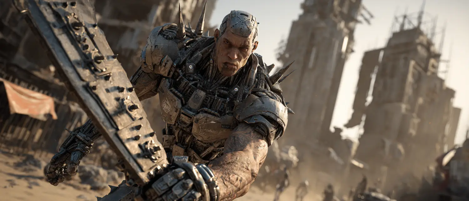武器:枪灰/黑色工业链锯(油污金属、火花)。