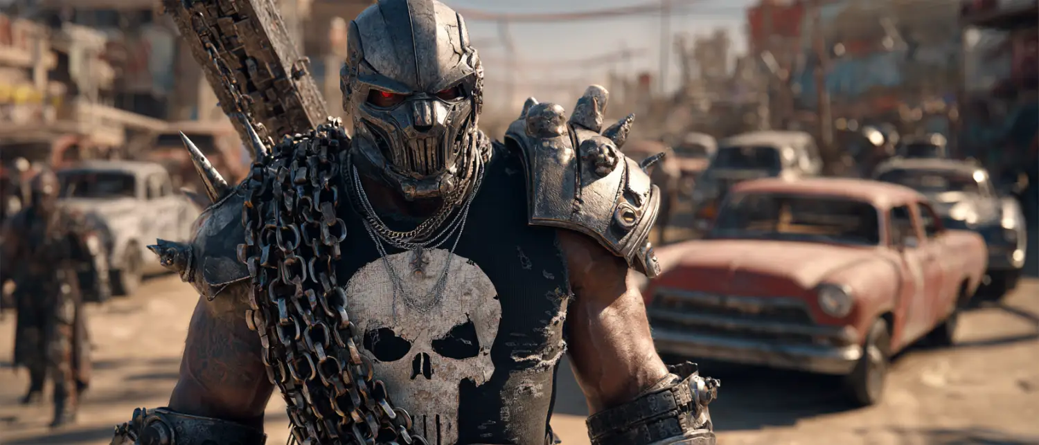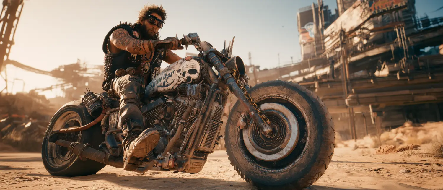 武器:锈链、废铁斧、倒钩棍;骨头涂鸦机车作背景。