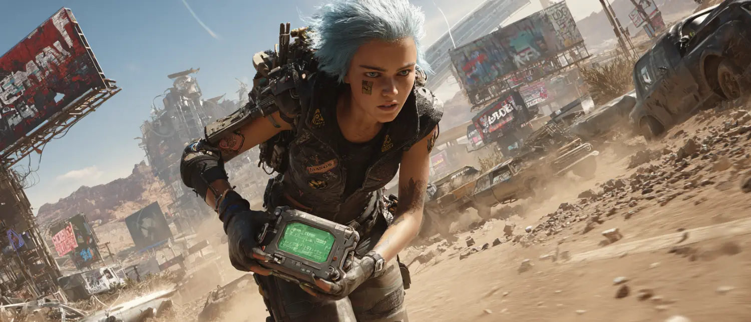 外观:黑色战术骇客装(机能面料、模组口袋),水蓝短发,水蓝细节灯条。