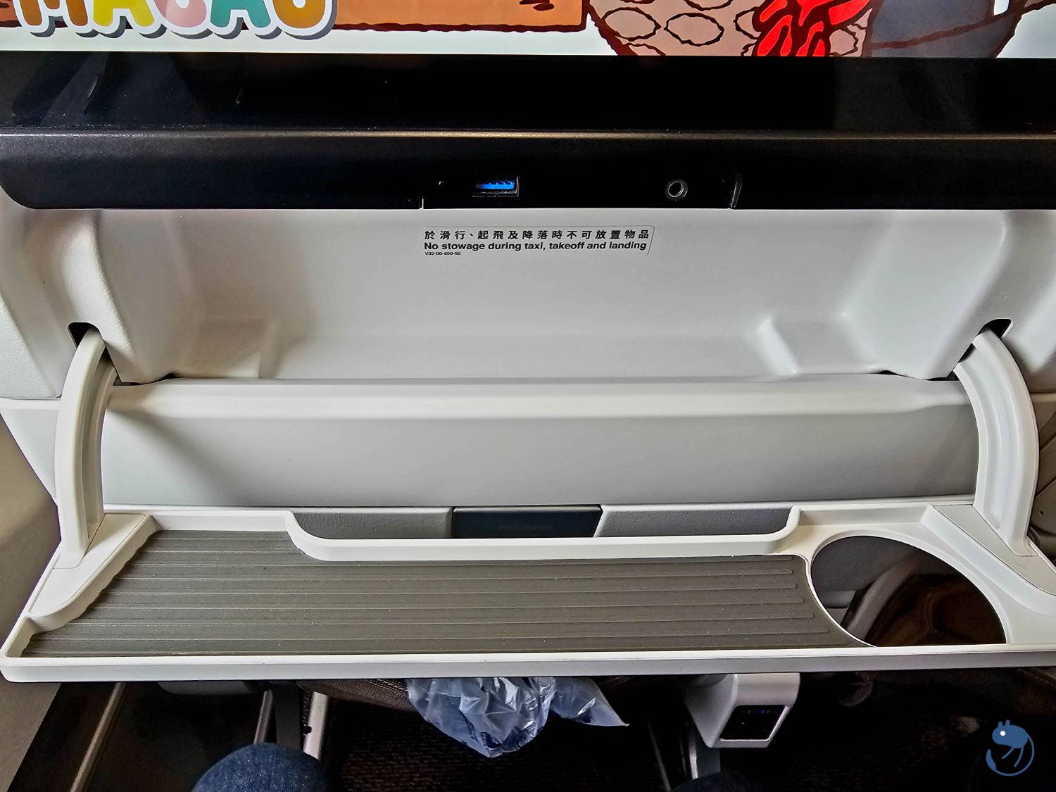萤幕下方的空间可以放手机或是平板,右边可以放饮料,另外还有耳机孔与 USB Type A