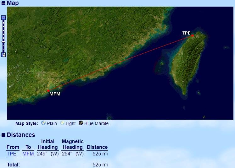 台北到澳门距离为525 miles,预计飞行时间为2小时。