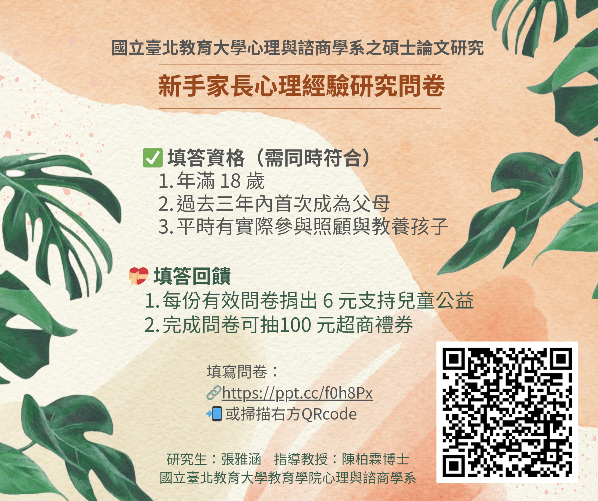 - 每份有效问卷,我将捐出新台币 6 元支持儿童心理与身心福祉