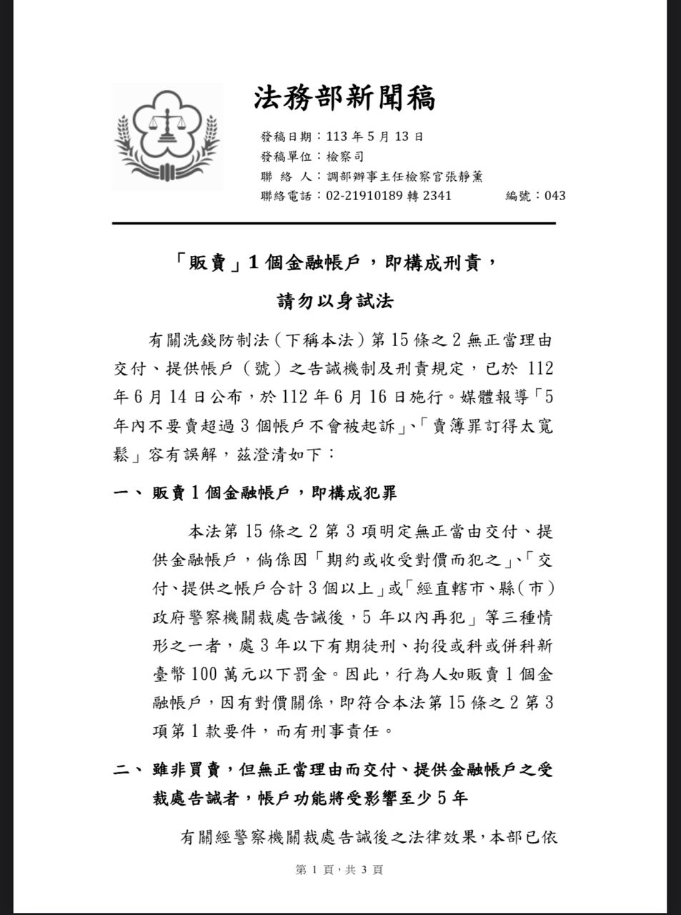 74F:推 analysis5566: 「贩卖」1 个金融帐户,即构成刑责, 请勿以身试法 03/07 00:01