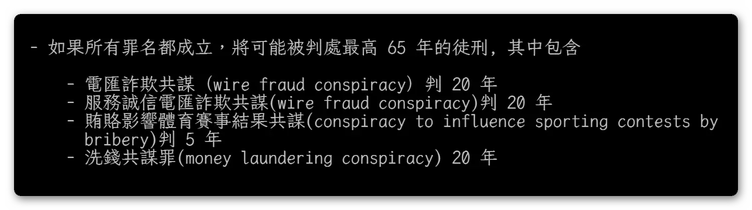 : 影响运动赛事等罪名,如果指控成立,两人最高恐面临长达65年的监禁。