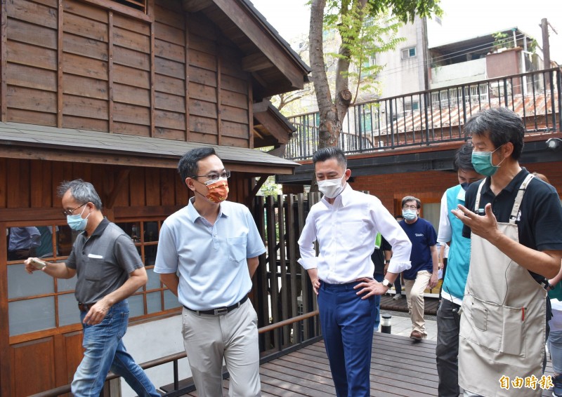 民进党桃园市长参选人林智坚(左1)参访中坜区坜小故事森林馆。(记者李容萍摄)