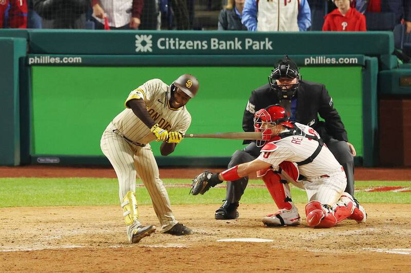 费城人投手多明奎兹(Seranthony Domínguez)缠斗至满球数後,面对一颗98