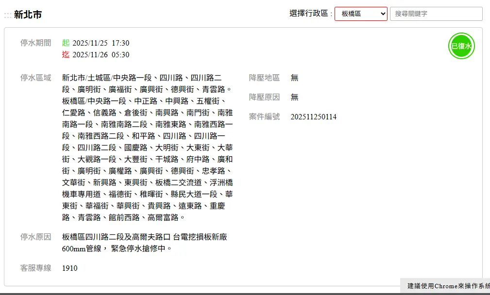 管线,紧急停水抢修中,板桥区、土城区部分区域暂时性停水,预计停水到明(26)日清
