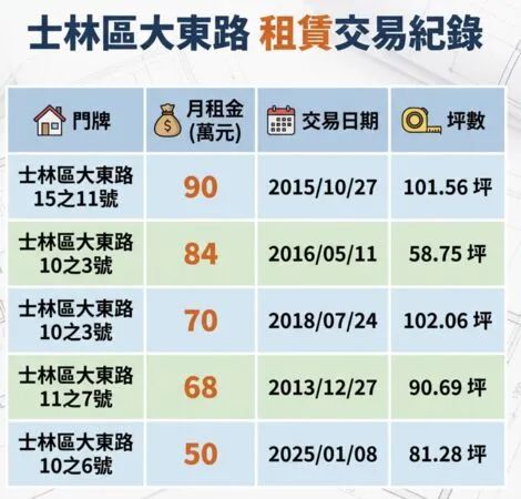 ▲士林夜市大东路最高价的5笔店面租赁交易。(AI协作/记者项瀚制作,经编辑审核)