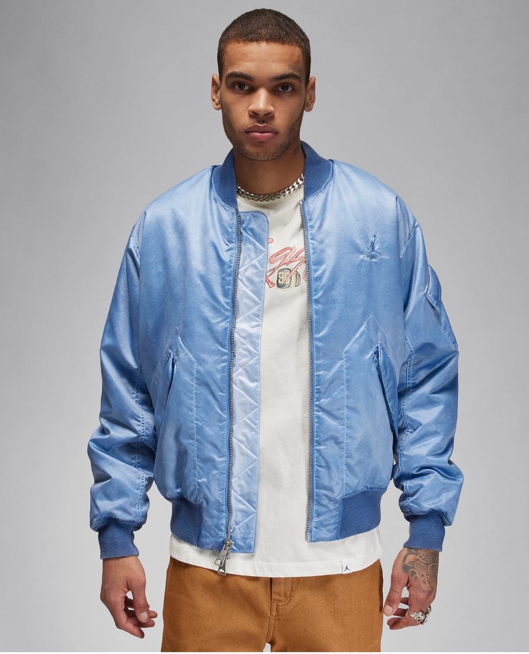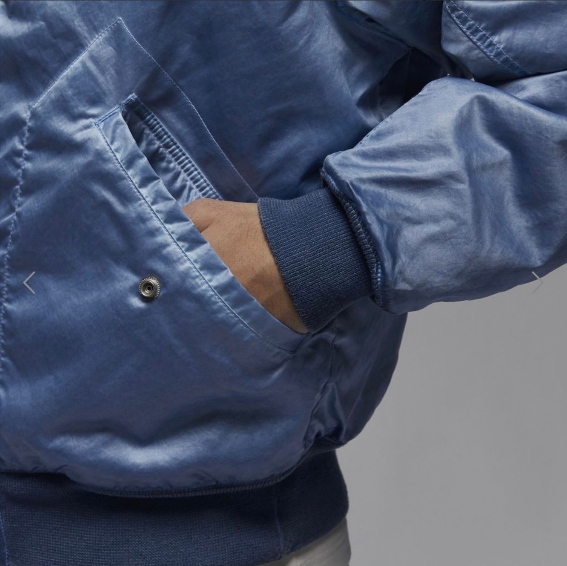 经典飞行员夹克,乔丹风格。这款轻盈的夹克采用梭织布料(光泽恰到好处)和合成保暖