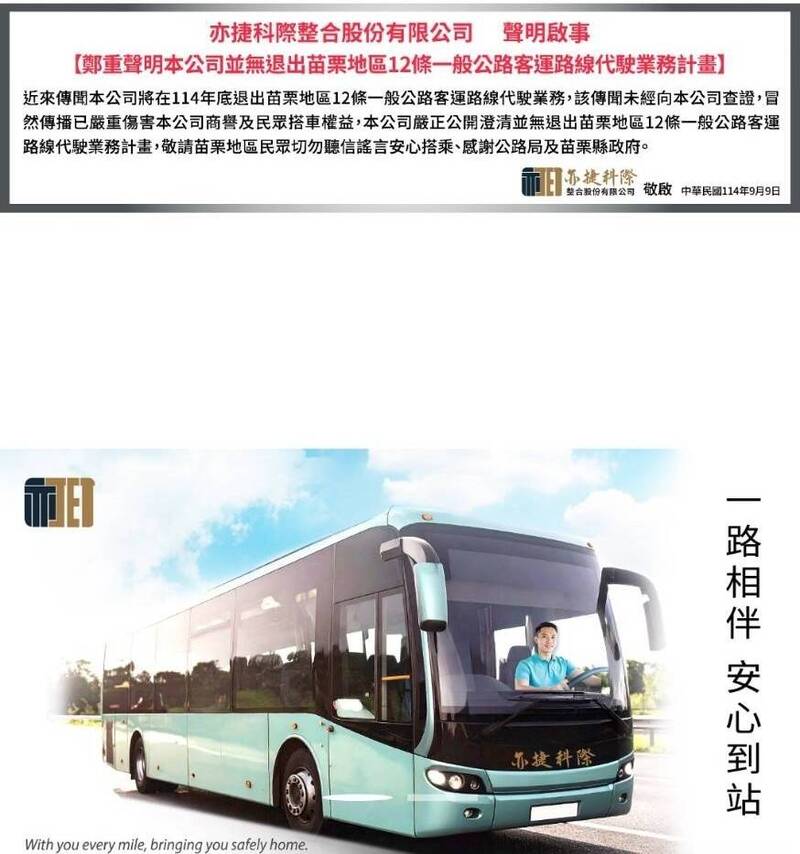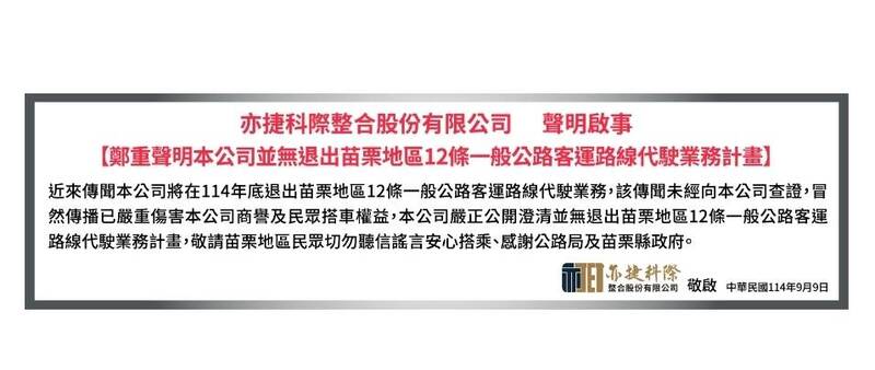 亦捷科际9日在公司官网首页公告,「郑重声明本公司并无退出苗栗地区12条一般公路客