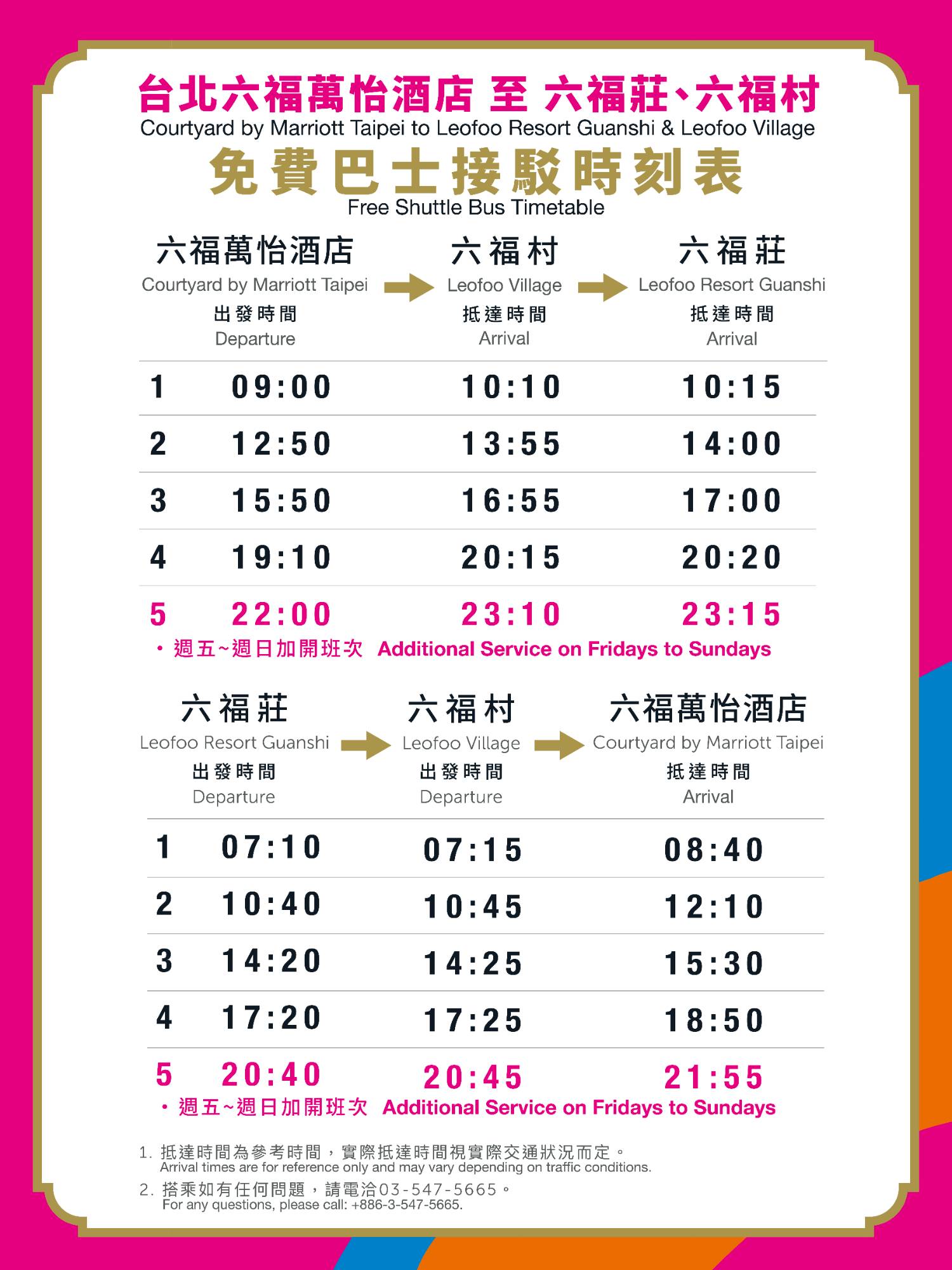 加开班次,串联台北六福万怡酒店(南港车站)、关西六福庄生态渡假旅馆与六福村主题