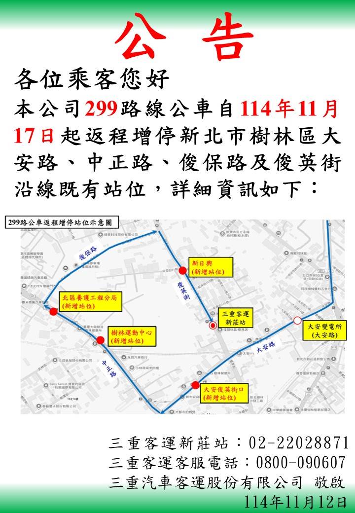 标题[情报] 11/17起 联营299路线新增返程树林端站位