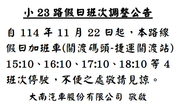 》 例假日 关渡码头区间加班车全部停驶,正规班次维持不变