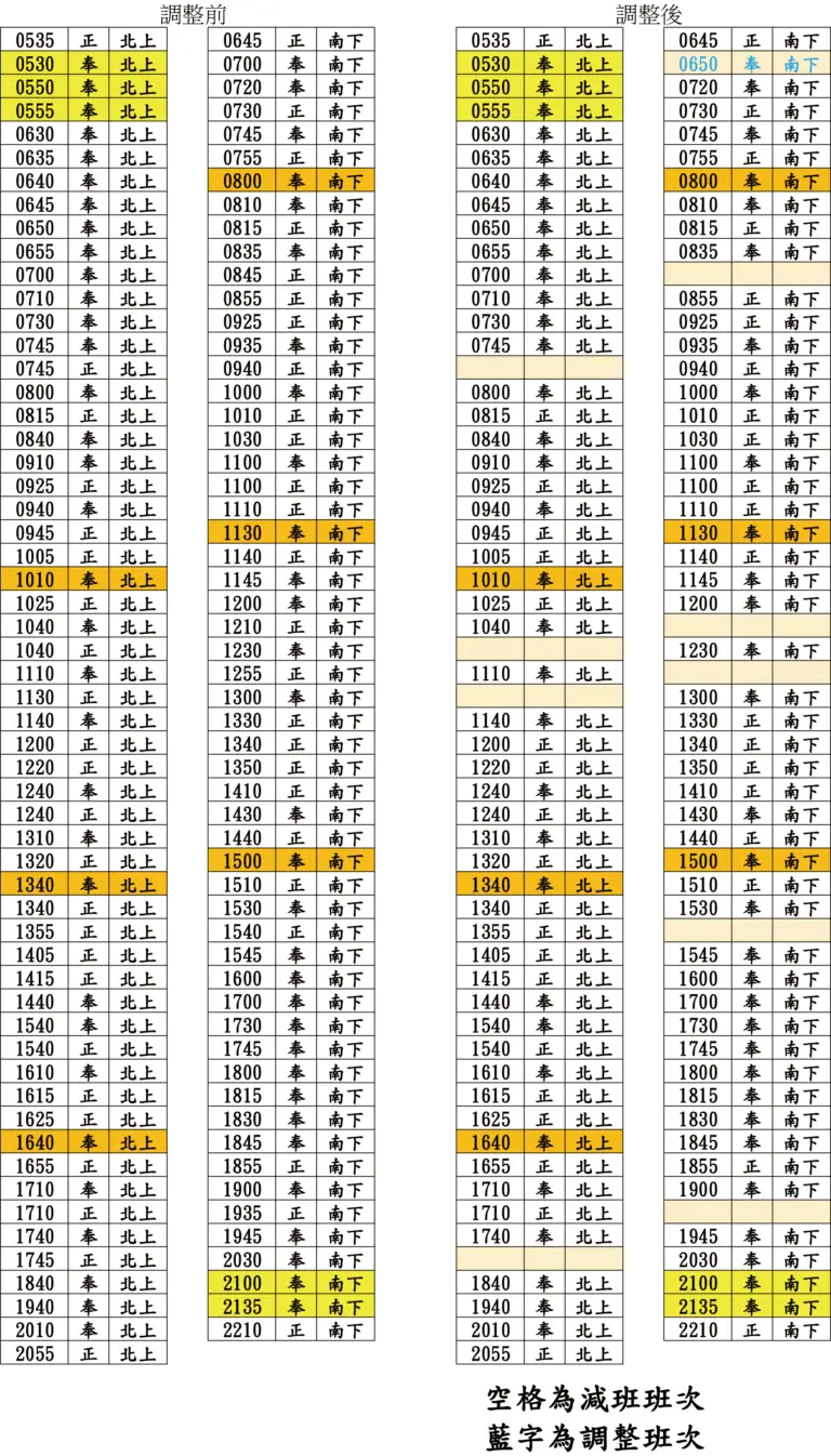 平日南下: 20 / 2 / 26 / 3 班次 (原 25 / 2 / 26 / 3 班次)