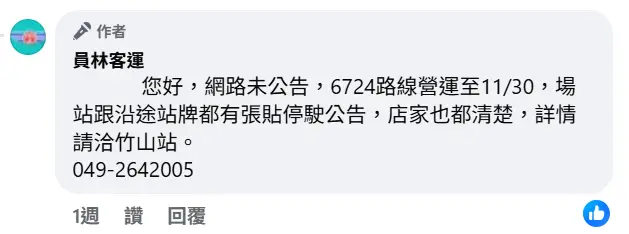 资料来源 员林客运 (网路无正式公告,仅留言简单描述)