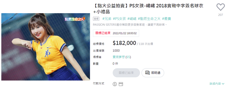 峮峮义卖签名球衣,结标金额飙破18万元。(取自YAHOO奇摩拍卖)