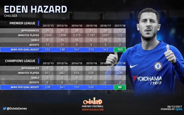 分钟可以制造一个进球;到了本赛季,比利时人在欧冠的表现达到巅峰,出场了6次,