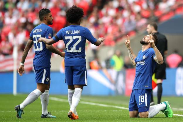 “吉鲁在足总盃中代表切尔西又进球了。在我看来,吉鲁持球时间有点太长了,但他