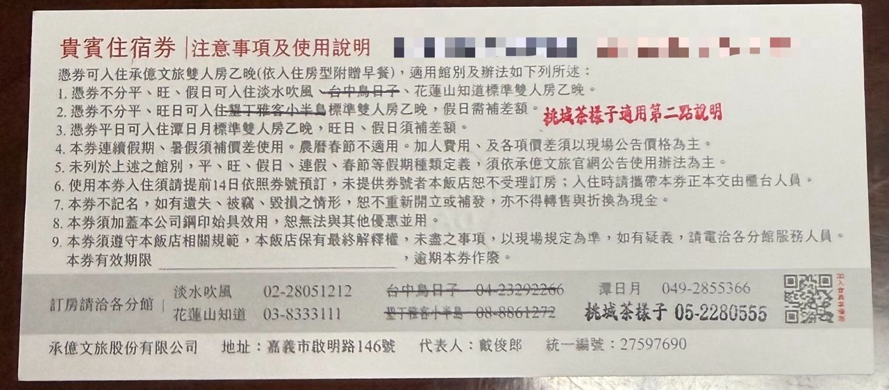 1479F:→ maytomato: [售]承亿文旅 住宿券 ,2100元,潭日月 /桃城茶样子 01/11 19:54
