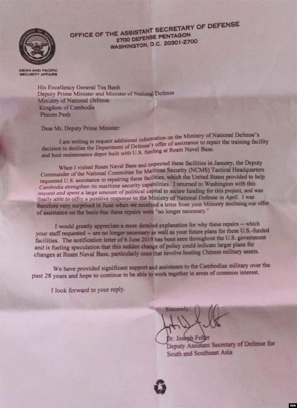 泄漏出来的美国副助理国防部长费尔特给柬埔寨国防大臣迪班的信函