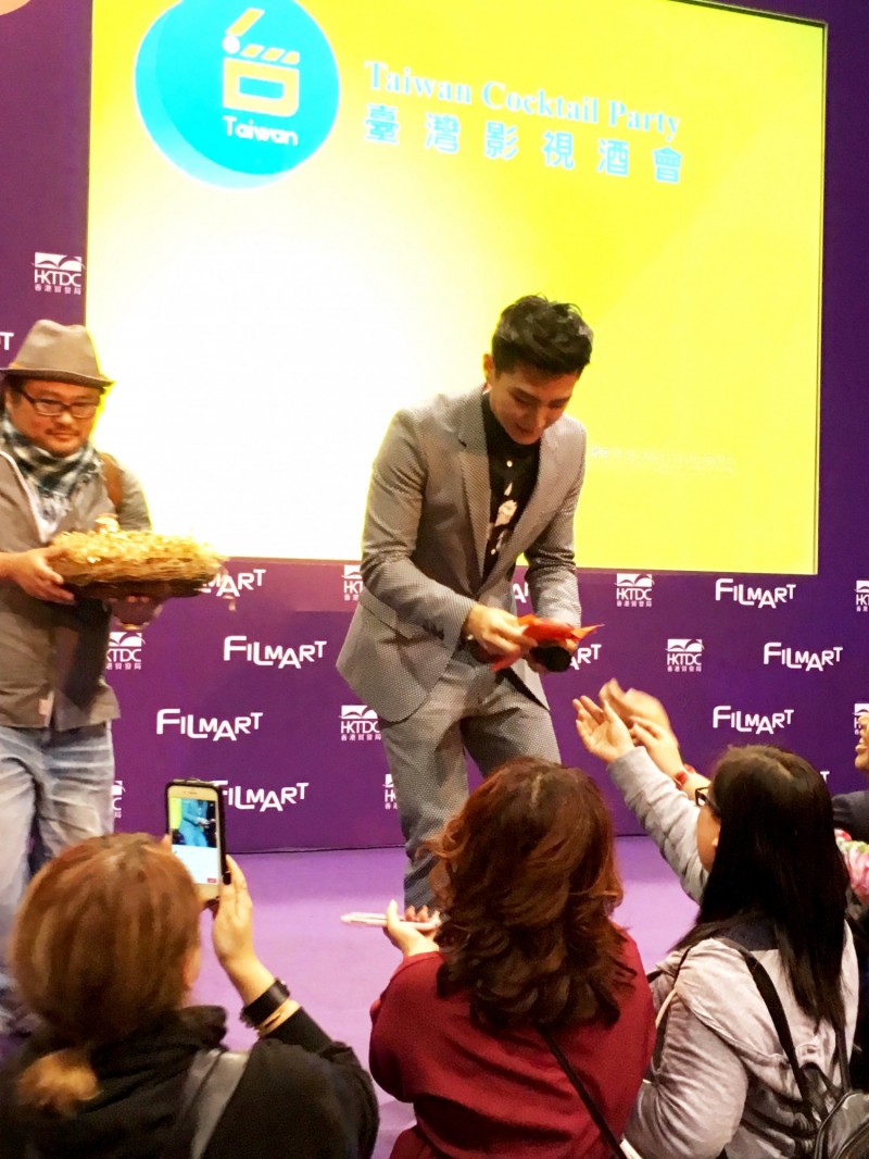 「台湾馆」於前日3/15下午在香港展览会议中心Event Room举行「台湾影视酒会」,为活动揭开序幕,由资深媒体人麦若愚担任酒会主持人,为台湾影视作品宣传造势。酒会现场聚集500多位国内外参展人士参与,场面热络。文化部影视局主任秘书潘舜昀及台北经济文化办事处处长严重光双双出席酒会,加上台湾赴港的演员与导演济济一堂,星光灿烂。