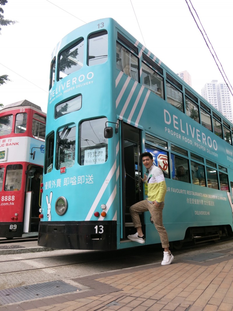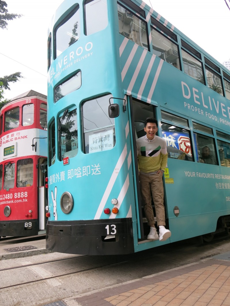 炎亚纶前天在香港体验当地特别的叮叮车。