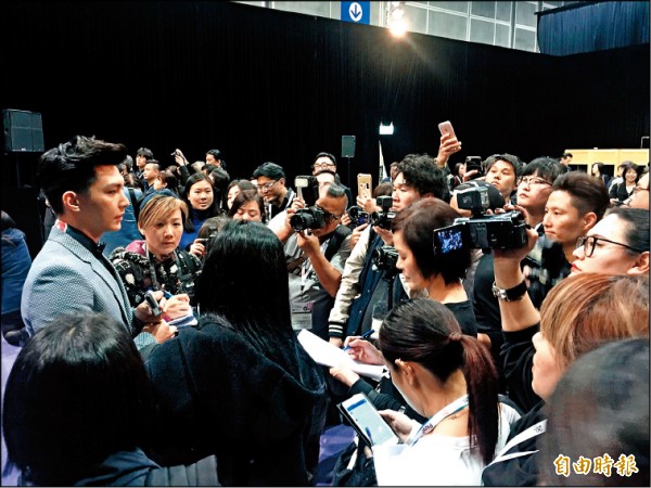 炎亚纶(左)在场内受访,超过15家媒体团团围住他。
