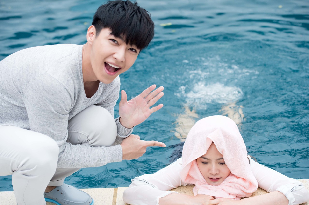 曾之乔(左)在《後菜鸟的灿烂时代》掉落泳池,炎亚纶跳下水去抢救(三立提供)