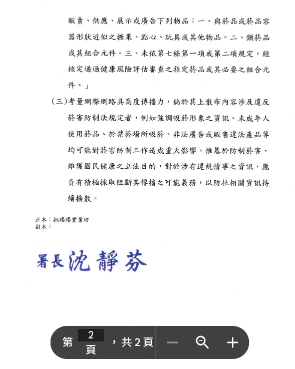 包含「签名档」也不可以有任何涉嫌推广香菸(及电子菸、加热菸…)的文字或超连结