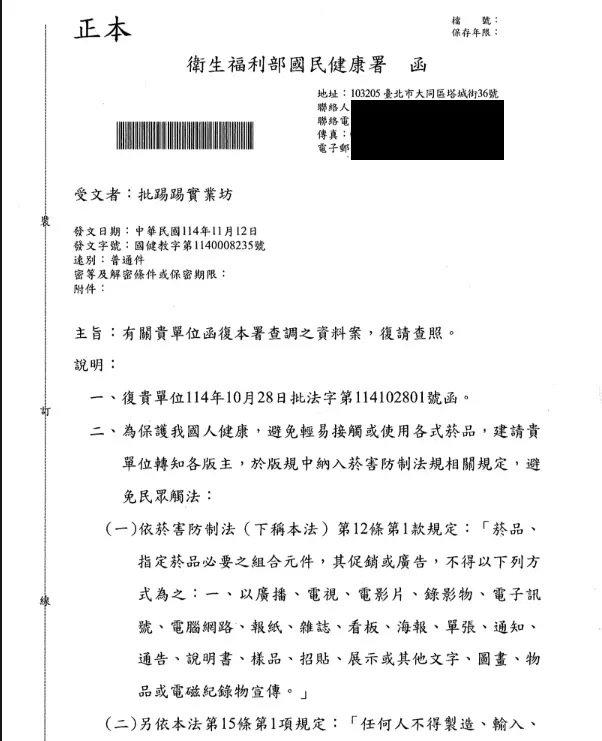 本站收到卫福部来函