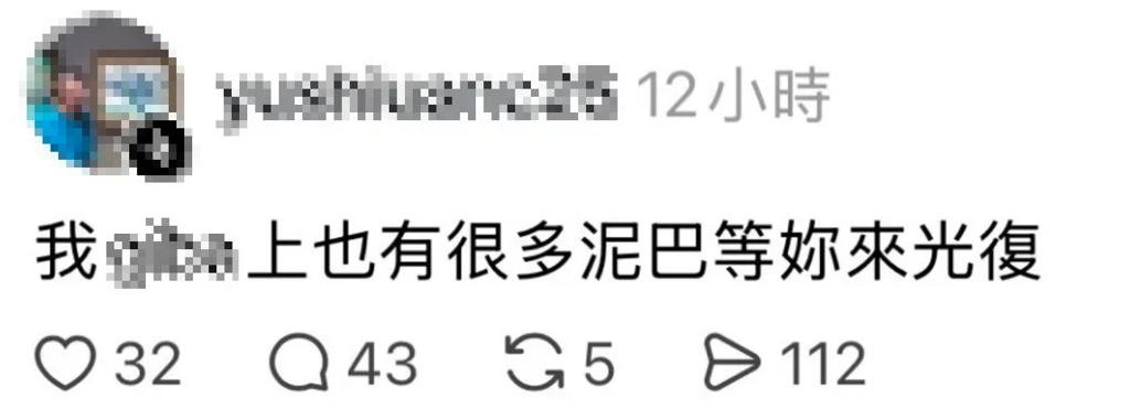 这名男网友近日在李多慧的救灾文留言性骚扰:「我XX上也有很多泥巴等你来光复」,此