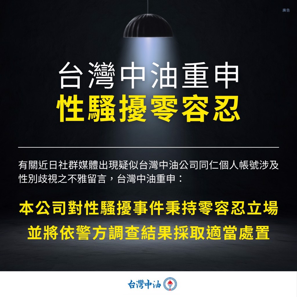中油重申性骚扰零容忍。(图/台湾中油官方脸书)