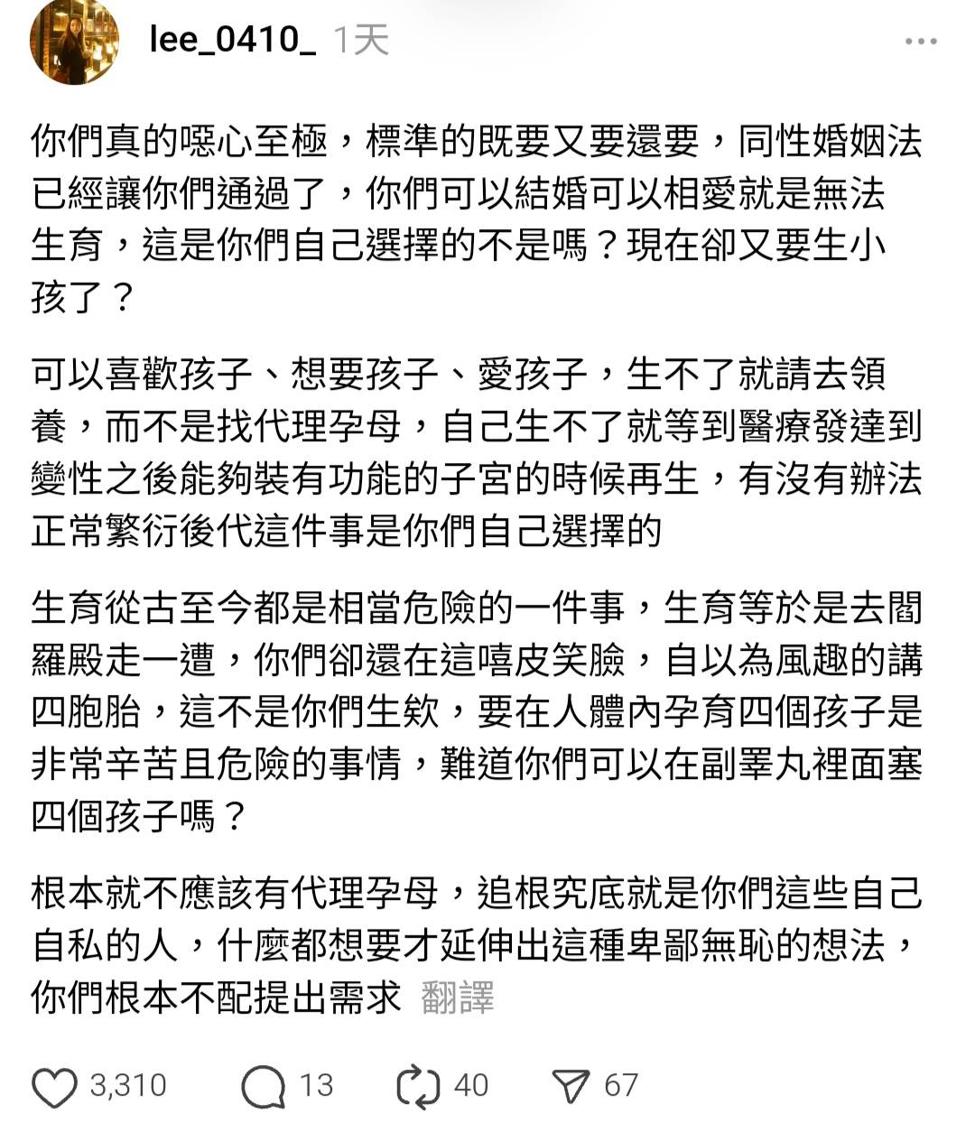 在Threads发文坦言,受精卵是植入两位不同的代理孕母,两位孕母同时怀上双胞胎的可能