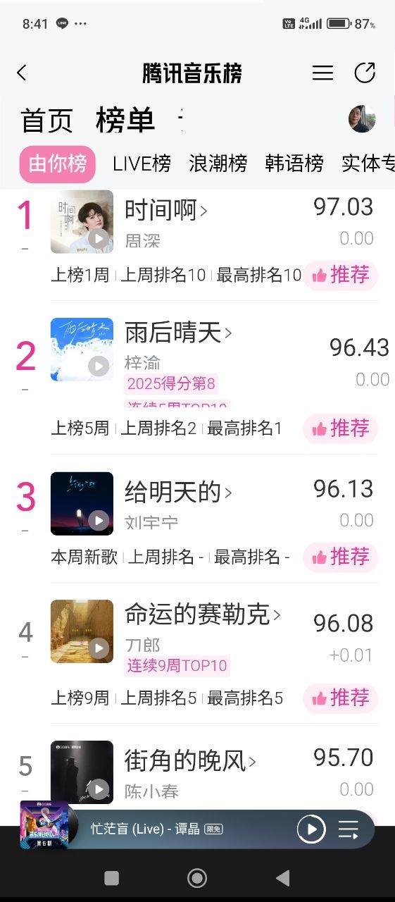 以腾讯音乐的两个榜单中,前五名算是烟嗓歌手的只有刀郎,其他周深,刘宇宁,陈楚生