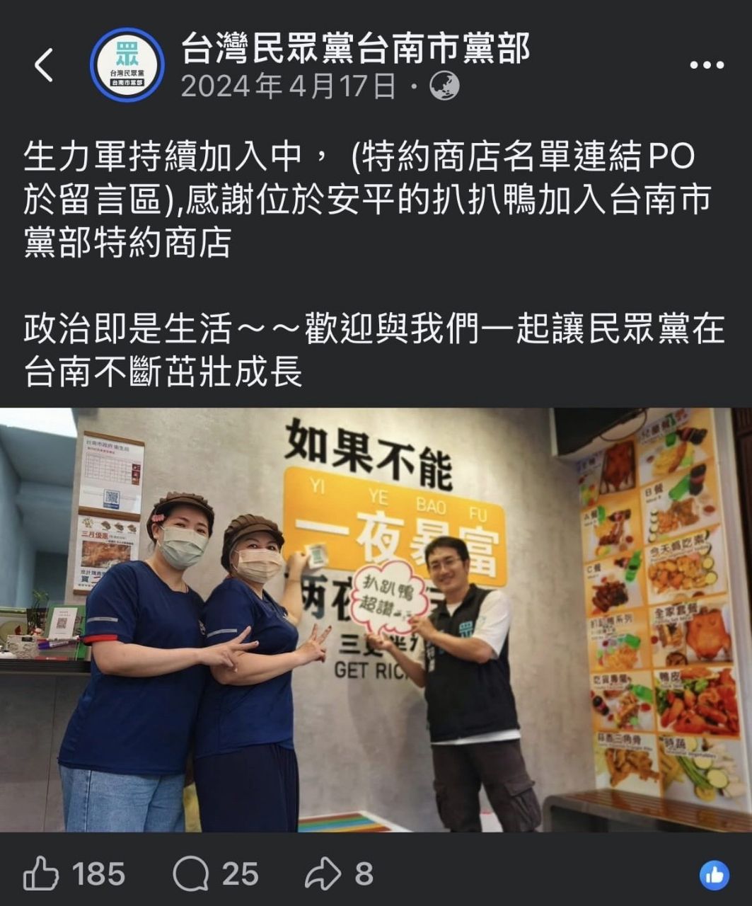 对於特约商家身份被曝光後引发的讨论,民众党台南市党部发布声明指出,民众党一向坚持