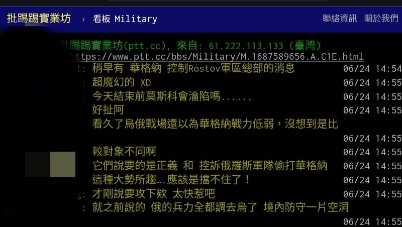 严格说起来ptt军武版算是异类,没有接受中国那套俄罗斯赢得战争的叙事,每天在算俄罗斯死了多少人。