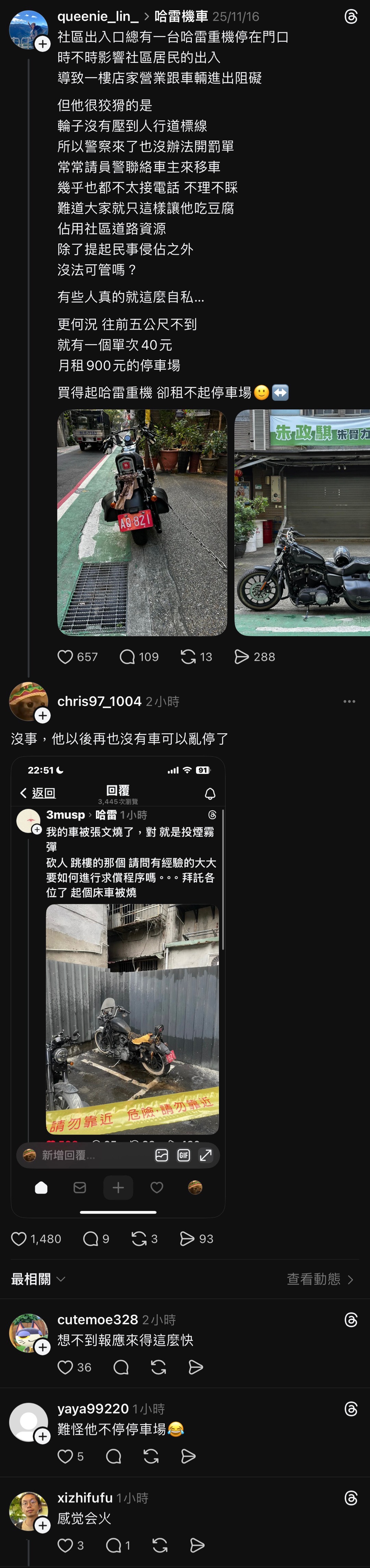 文大家的看法不一,有人找出这辆哈雷机车曾有停在社区出入口挡路的纪录。