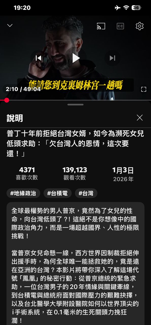 看到这个YT説台湾有救过普丁女儿