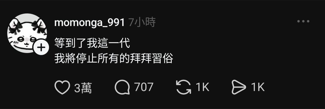3F:→ Beinlie: 没有下一代也是一种停止拜拜习俗的方法 111.71.214.132 02/16 17:14