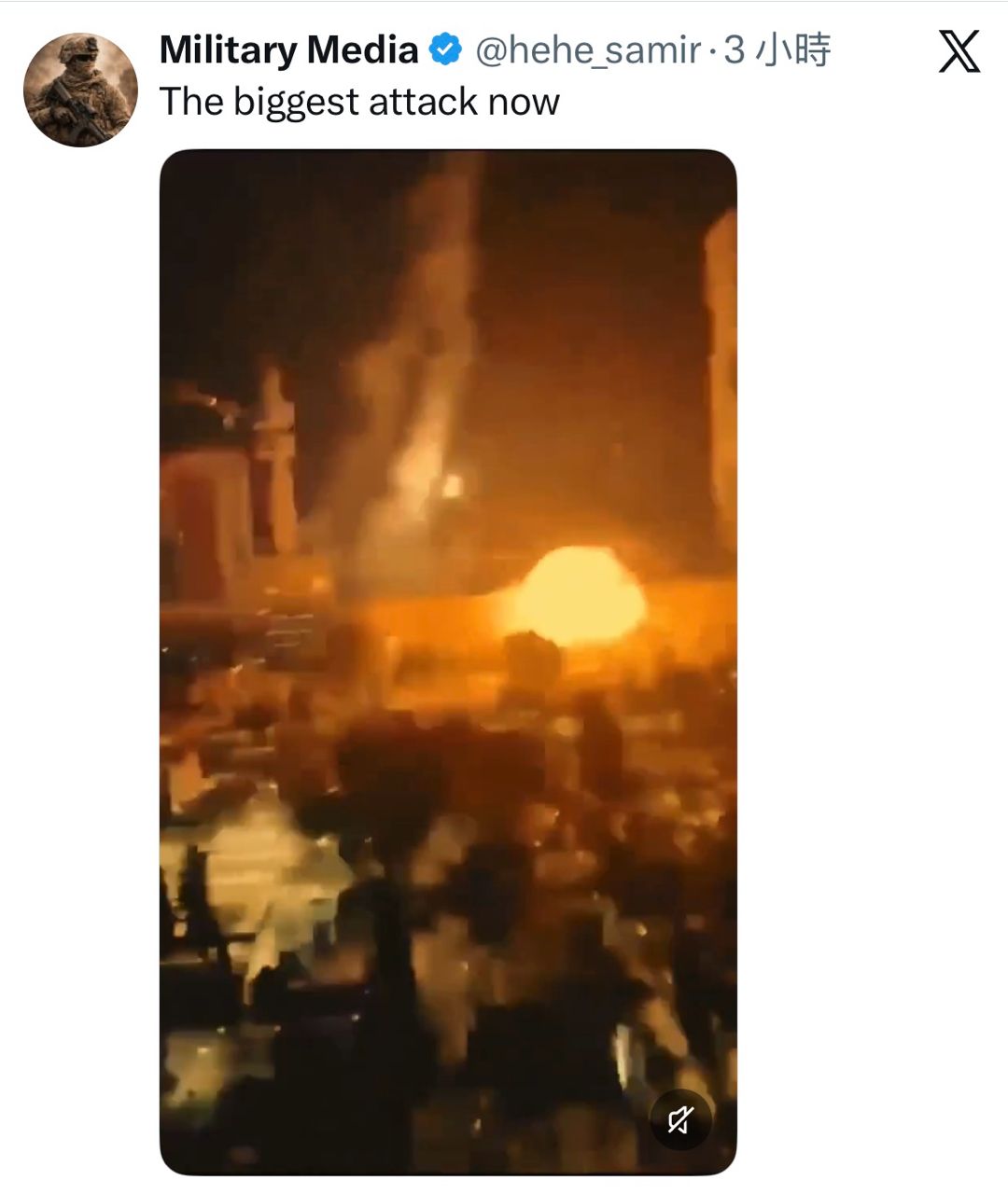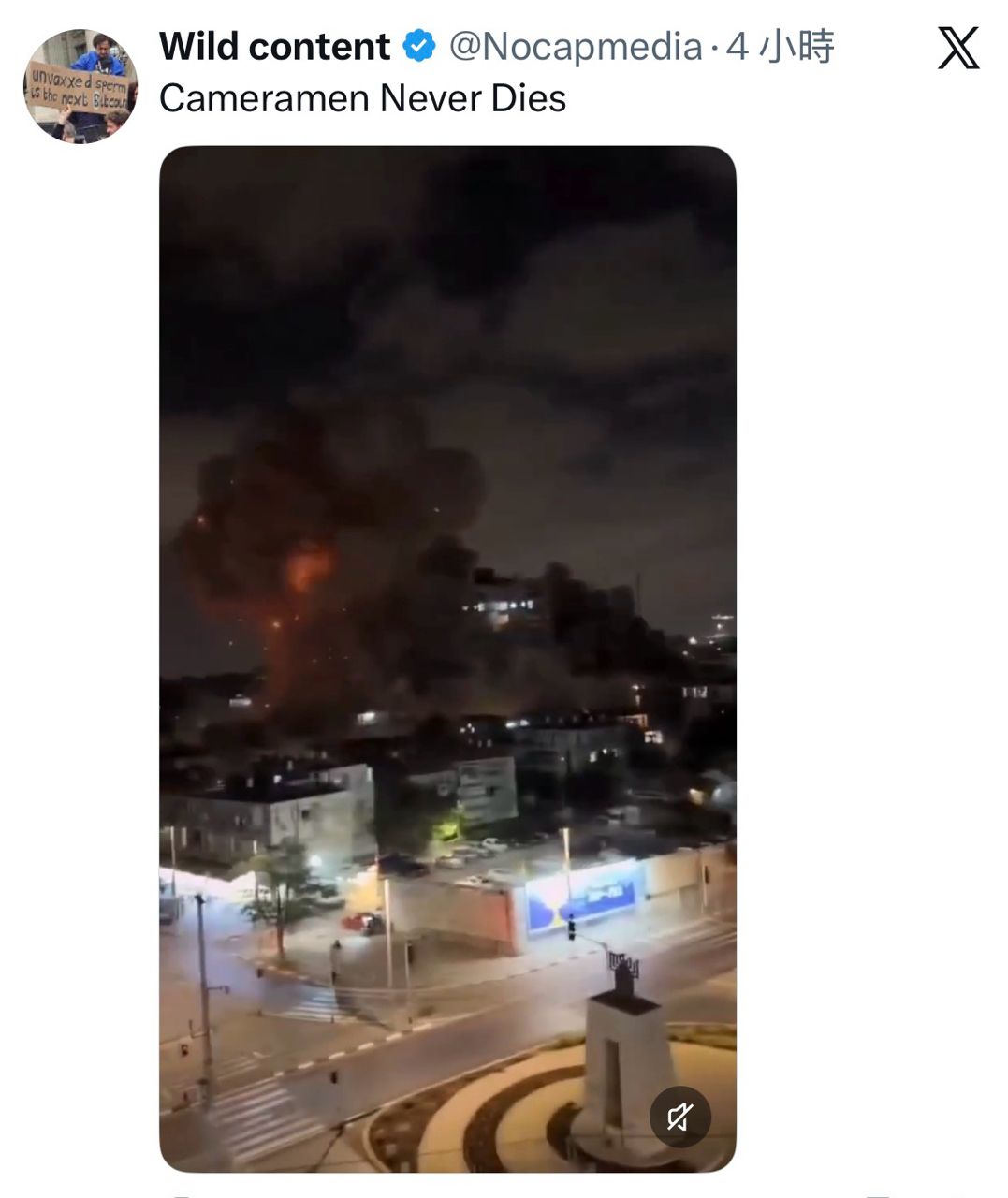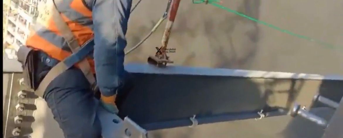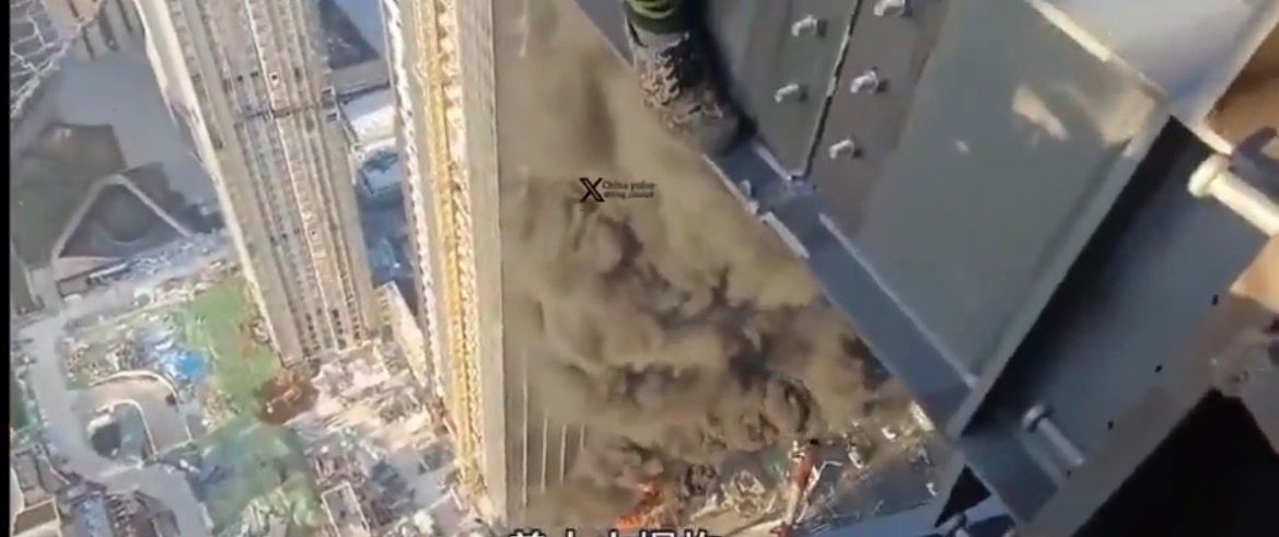 X上流传一个影片,一名工人在以色列特拉维夫大楼钢梁上,结果下面大楼刚中弹,整个
