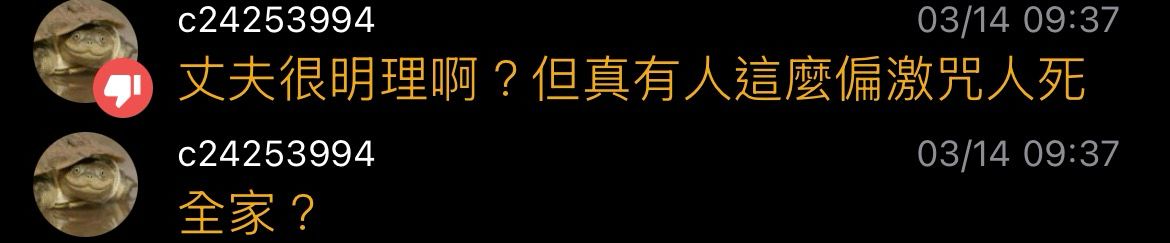 52F:嘘 c24253994: 丈夫很明理啊?但真有人这麽偏激咒人死 27.240.219.254 03/14 09:37