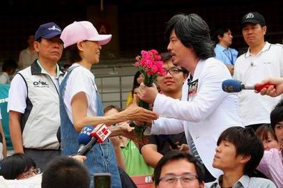 看球,由於黄国伦因应母亲节,准备了一整束的康乃馨要送给现场的女性朋友,得