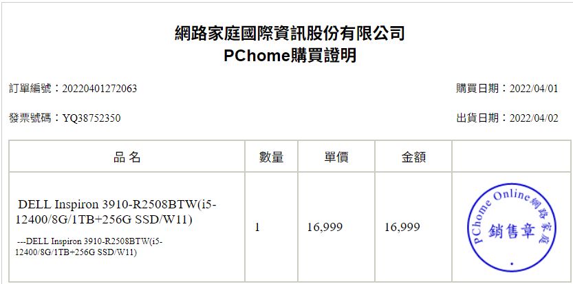 ◎硬体型号: DELL Inspiron 3910 桌上型电脑(i5-12400/16G/1TB+256G SSD/W11)