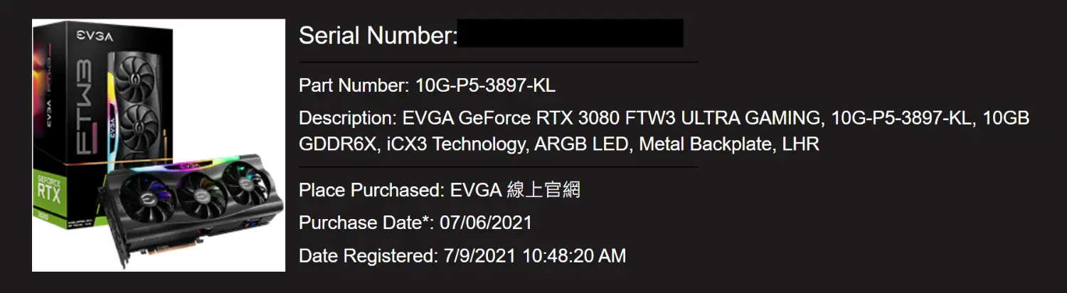 ◎硬体型号: EVGA GeForce RTX 3080 FTW3 ULTRA GAMING 10GB(LHR)