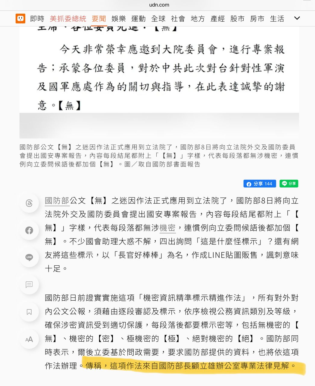: 国防部今(6)日表示,「国军机密资讯精准标示精进作法」系参据美军及国际友盟国家