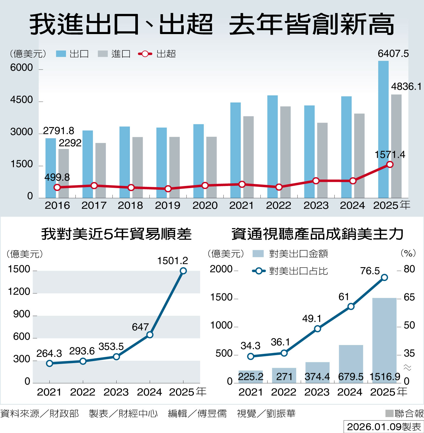 财政部昨公布二○二五年进出口统计,去年全年出口、进口、出超金额全面写下历史新高