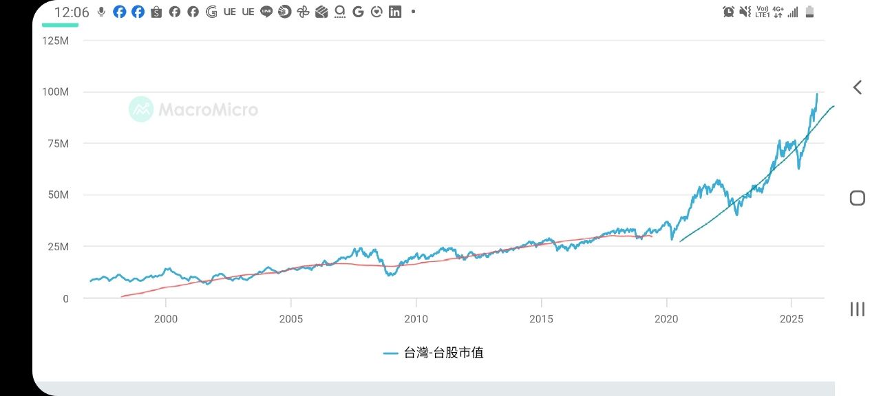 2020之前台股市值的斜率和2020之後,明显呈现两种趋势。