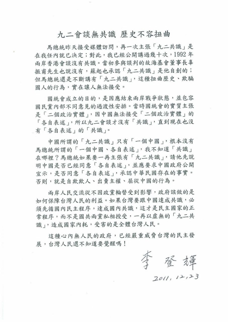 2F:嘘 gogen: 1.李登辉说了,92会谈本来就没有92共识,是 49.217.49.181 02/05 19:05