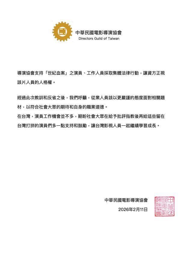 电影《世纪血案》争议持续发酵,中华民国电影导演协会今(11)日发布声明,正式表态支持