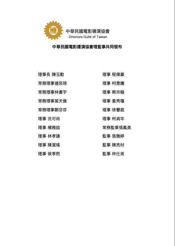 事长陈玉勳领衔,以及包括叶天伦、程伟豪、郑芬芬等多位知名导演在内的理监事共同发布